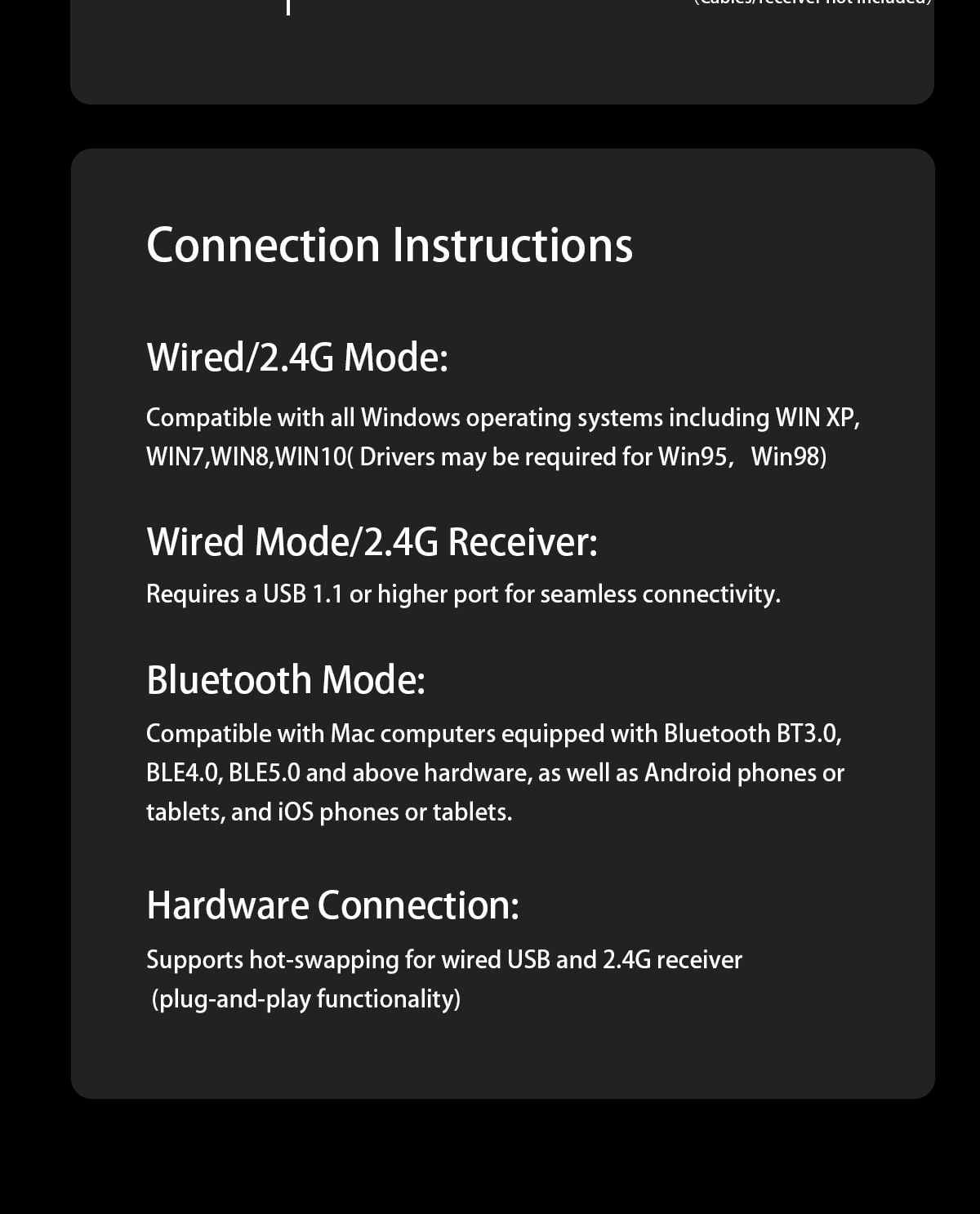 Chế độ có dây USB: 8000Hz Chế độ 2.4G: 1000Hz Chế độ Bluetooth: 125Hz |