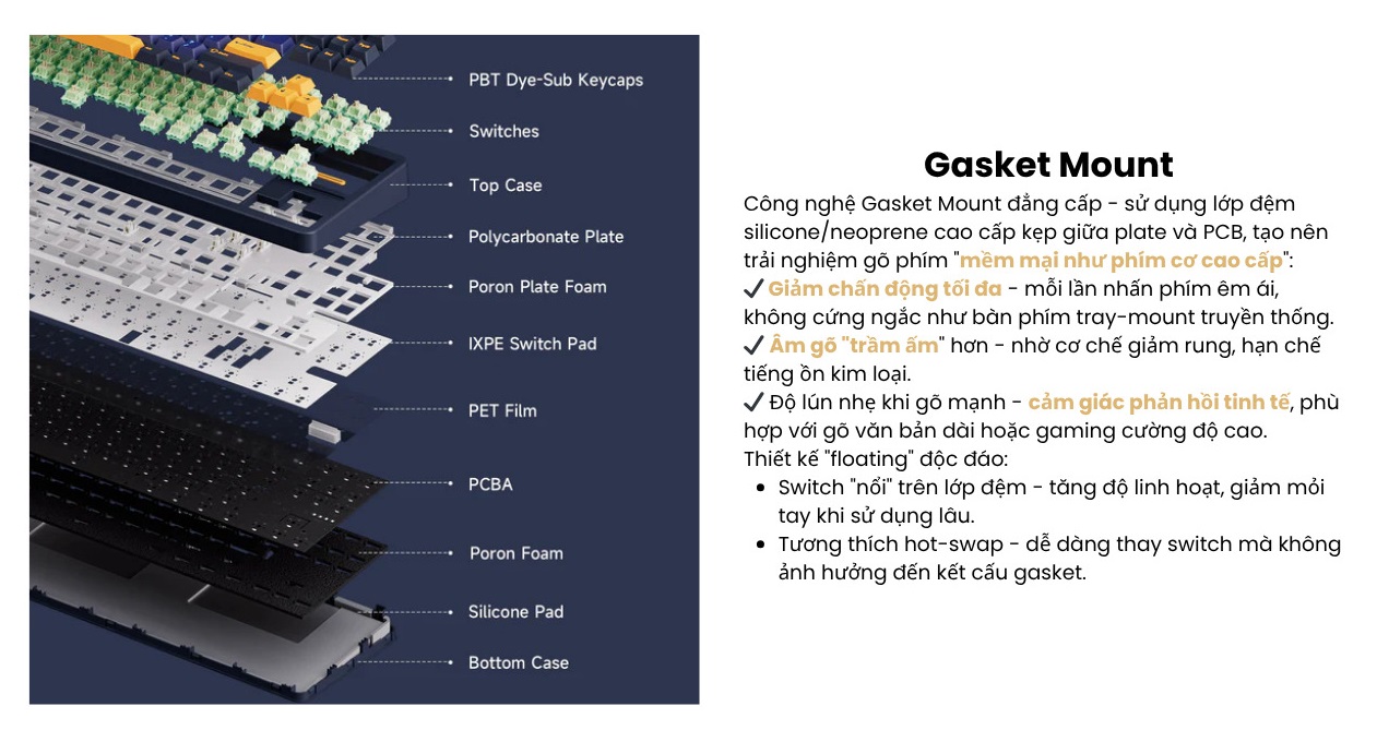 Cấu trúc: Gasket mount, plate PC, có foam tiêu âm nhiều lớp