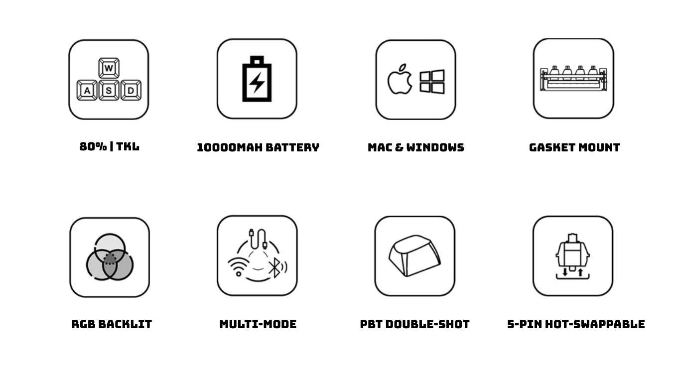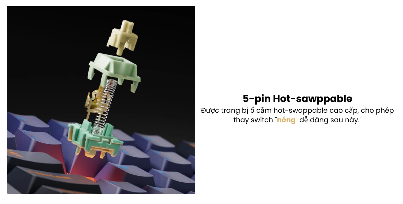 - Mạch xuôi, hotswap 5-pin thay nóng switch dễ dàng - Cấu trúc gasket mount cùng 5 lớp đệm tiêu âm - Tấm cố định (Plate) bằng PC - Stabilizer plate mount |