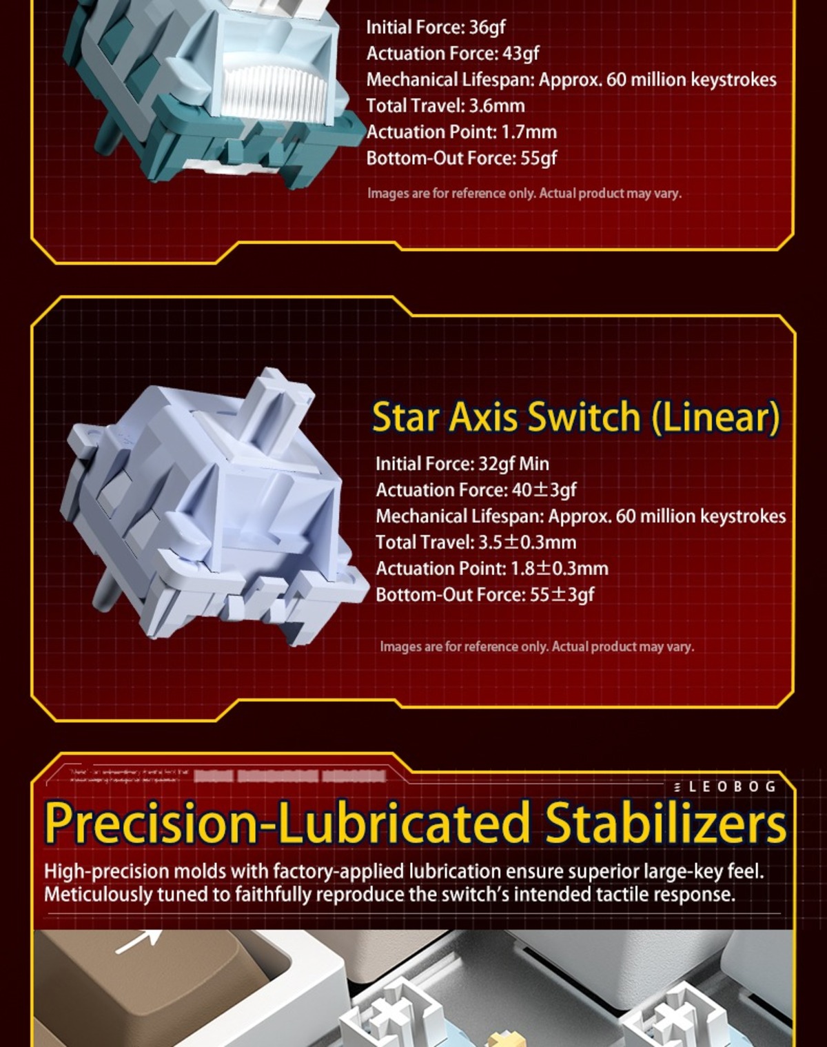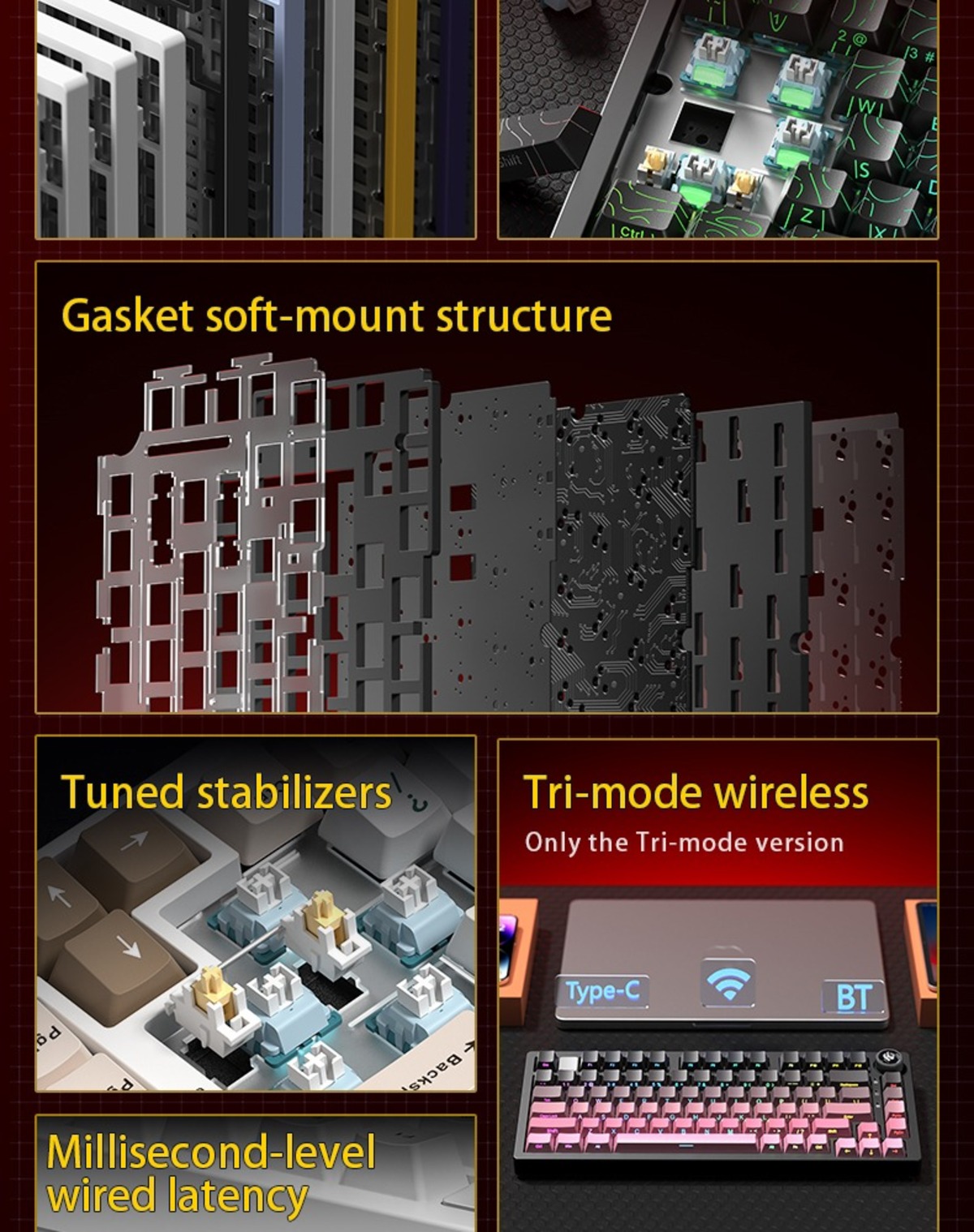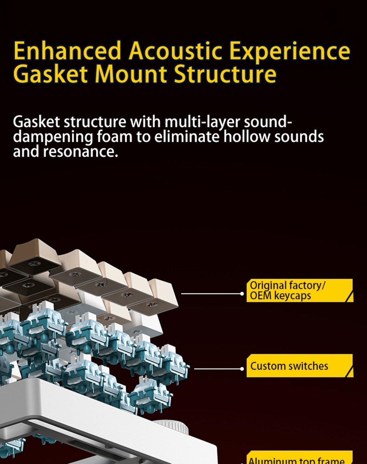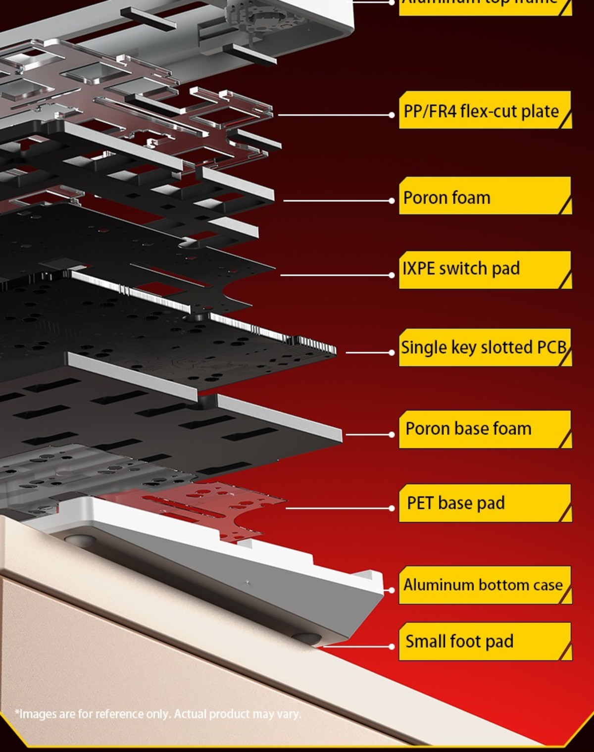- Mạch xuôi, hotswap 5-pin thay switch dễ dàng - Cấu trúc gasket mount cùng nhiều lớp đệm tiêu âm - Stabilizer plate mount được lube sẵn ở nhà máy |