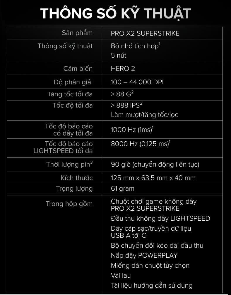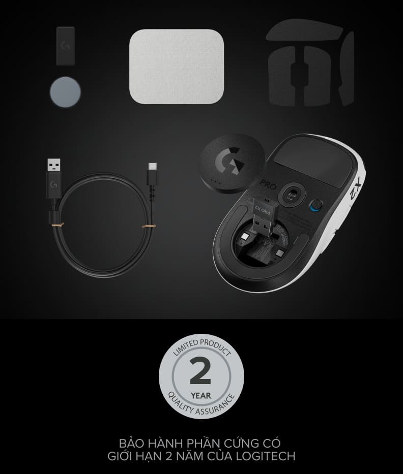 - Chuột Chơi game Không dây PRO X2 SUPERSTRIKE - Đầu thu không dây LIGHTSPEED Receiver - Cáp sạc/truyền dữ liệu USB-A sang USB-C - Bộ chuyển đổi kéo dài đầu thu - Nắp đậy POWERPLAY với chân đế PTFE - Bộ miếng dán chống trượt (grip tape) - Khăn lau - Tài liệu hướng dẫn sử dụng |