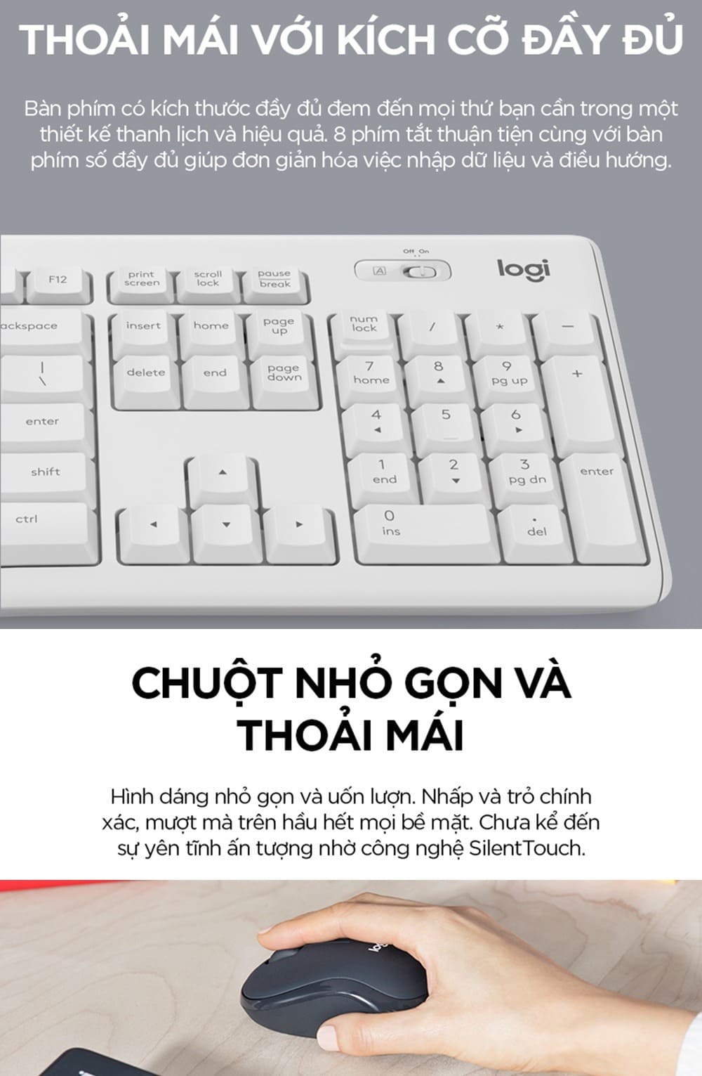 Âm thanh khi sử dụng: Công nghệ SilentTouch cho cả phím và chuột, giảm tiếng ồn lên đến 90%