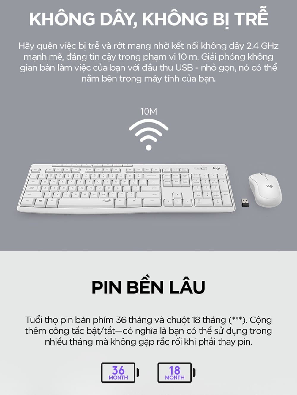 Tuổi thọ pin: Phím: Lên đến 36 tháng / Chuột: Lên đến 18 tháng