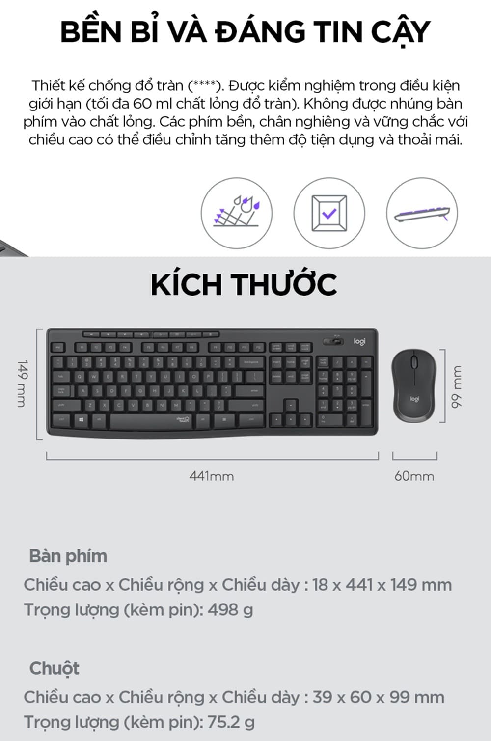 - Bàn phím: 498 g (bao gồm pin) - Chuột: 75.2 g (bao gồm pin) |