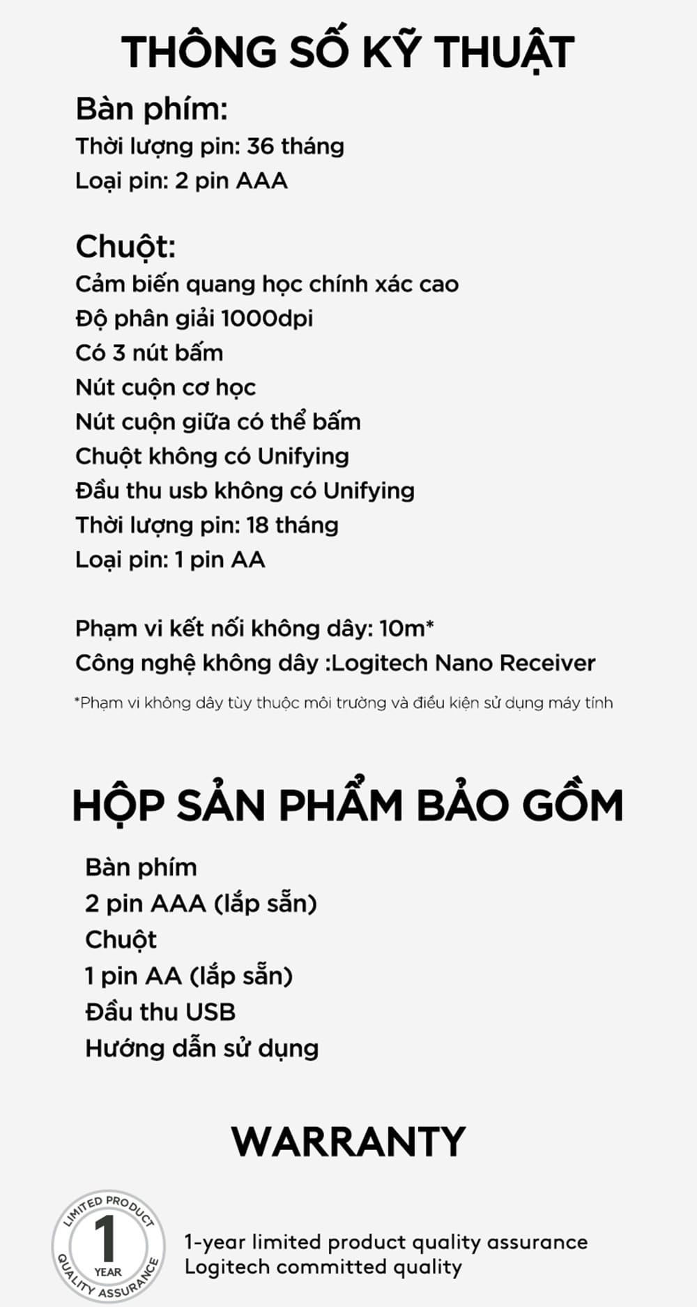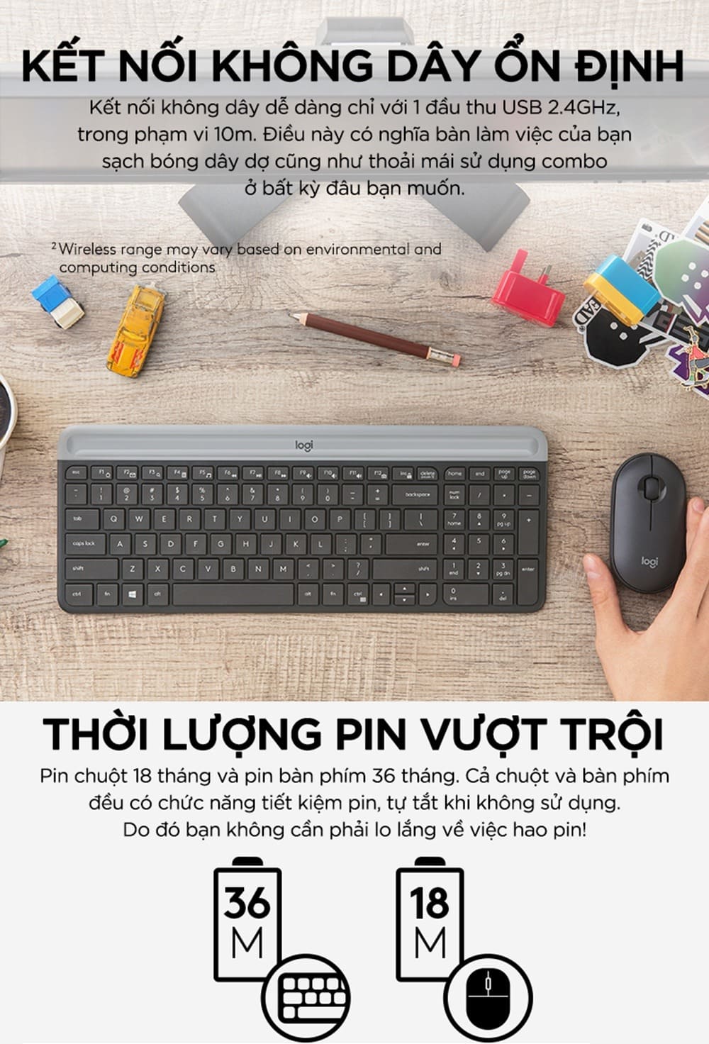 Tuổi thọ pin: Phím: Lên đến 36 tháng / Chuột: Lên đến 18 tháng