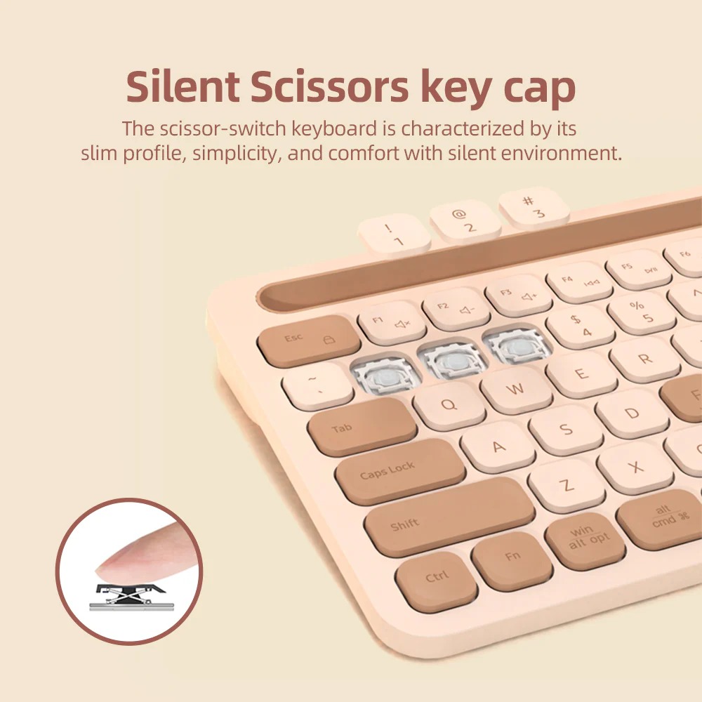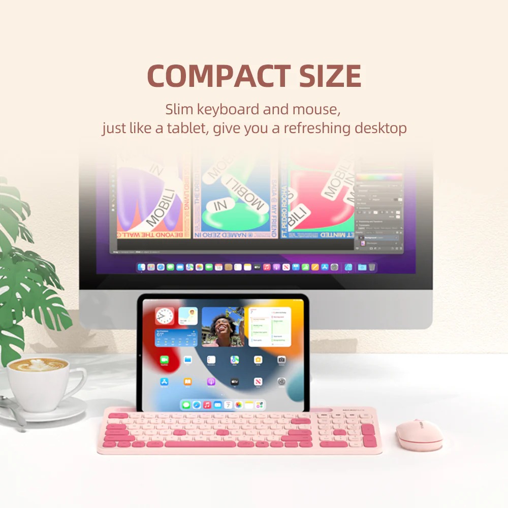 Không chỉ đẹp về hình thức, bàn phím còn có kích thước gọn nhẹ, rất tiện mang theo khi di chuyển hoặc làm việc linh hoạt giữa nhiều không gian. Chuột đi kèm có thiết kế công thái học nhỏ gọn, ôm tay, giúp bạn sử dụng cả ngày mà không bị mỏi cổ tay.