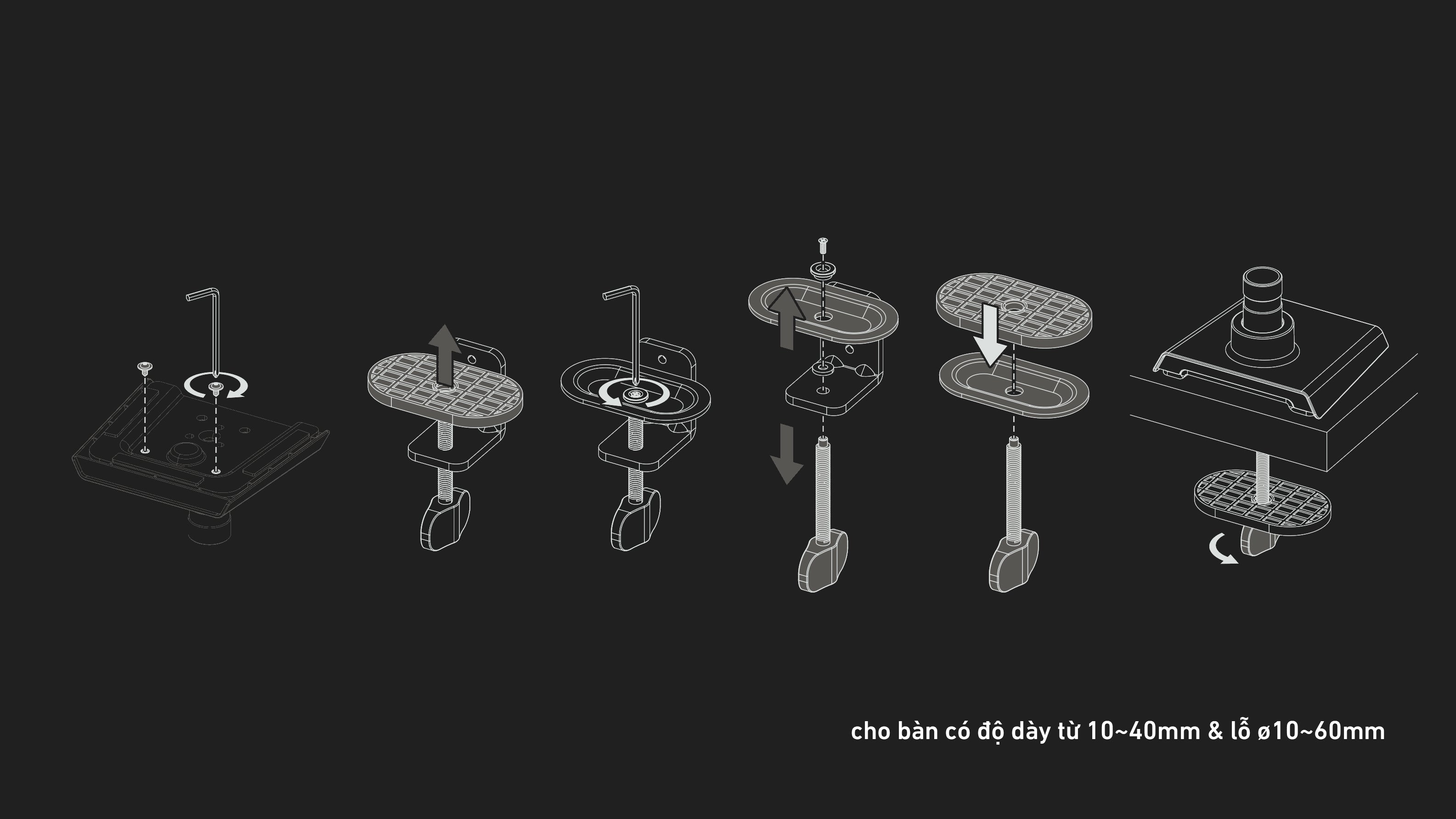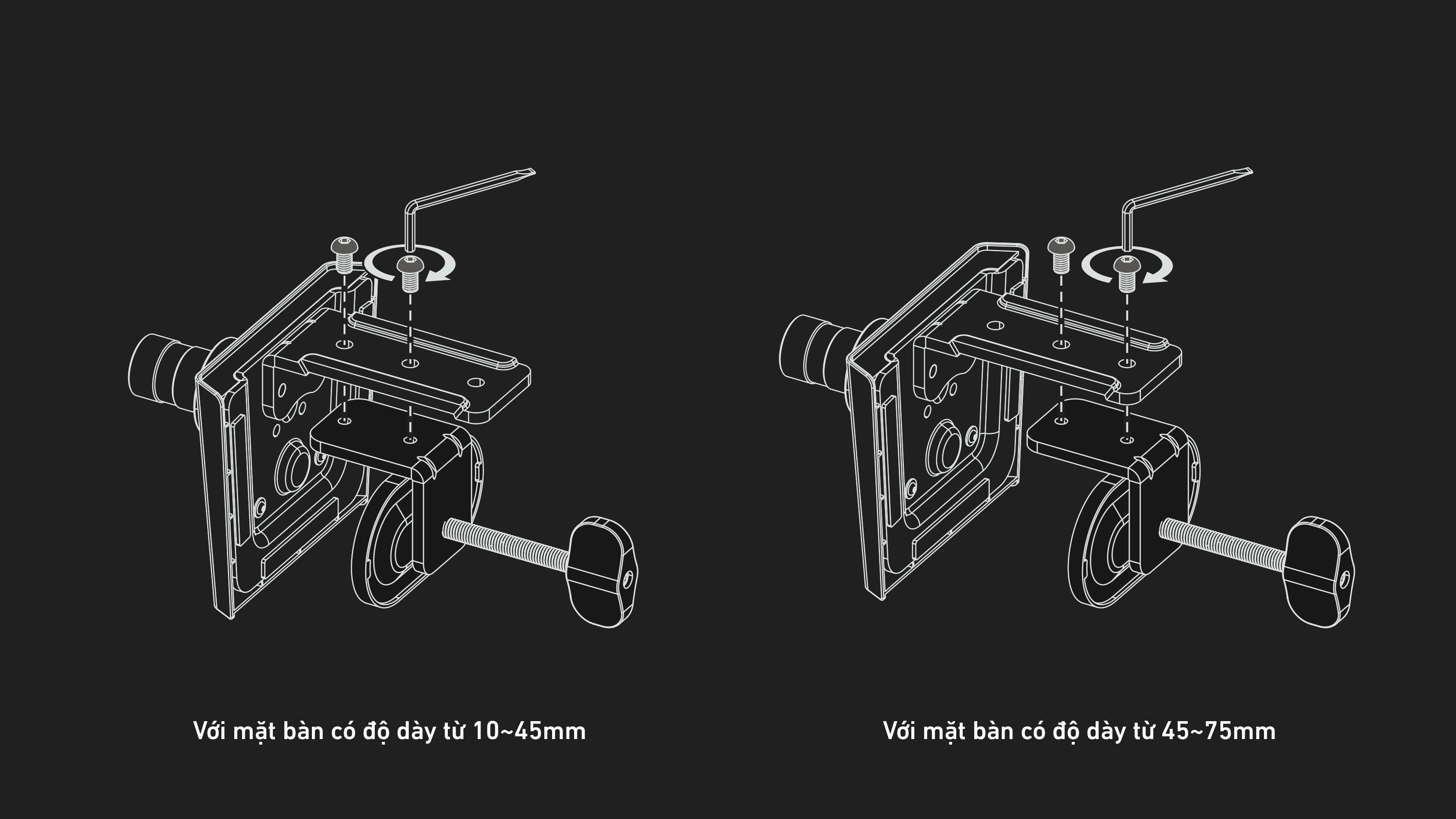 Áp dụng 2 hình thức kẹp hoặc khoan bàn, phù hợp với nhiều đồ nội thất và tiện lợi cho người dùng khi thao tác lắp đặt.