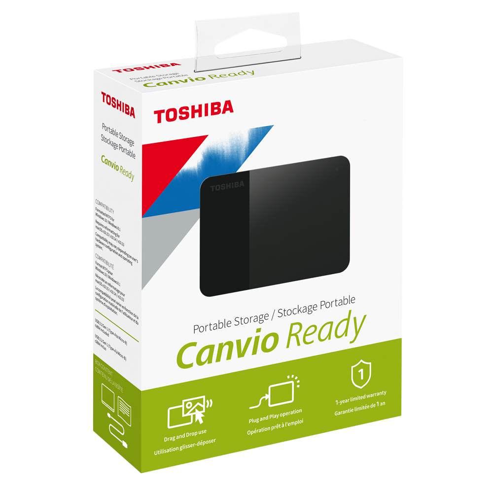 Ổ cứng di động HDD Toshiba Canvio Ready cho tốc độ truyền lên tới 5 GB/s (USB 3.0). Dung lượng từ 1TB đến 4TB giúp người dùng lưu trữ hàng ngàn dữ liệu khác nhau. Giao diện USB SuperSpeed cho khả năng truyền nhận cực nhanh, tiết kiệm thời gian. Canvio Ready bao gồm thiết kế tải theo đường dốc giúp ngăn ngừa hư hỏng ổ đĩa khi di động và cảm biến sốc sẽ cắt điện để bảo vệ dữ liệu trong trường hợp có tác động vật lý, vì vậy bạn có thể yên tâm rằng các tệp của mình được an toàn.