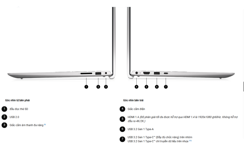 Để tối ưu cho công việc và học tập, Dell Inspiron 15 được trang bị hệ thống cổng kết nối cực kỳ đầy đủ và đa dạng, giúp bạn sẵn sàng tương tác với mọi thiết bị ngoại vi mà không cần đến các bộ chuyển đổi (hub) rườm rà. Máy sở hữu cổng USB 3.2 Gen 1 Type-A và USB 3.2 Gen 1 Type-C cho tốc độ truyền tải dữ liệu nhanh chóng lên đến 5 Gbps, cùng một cổng USB 2.0 bổ sung để bạn dễ dàng kết nối chuột, bàn phím hoặc máy in. Việc trình chiếu trong các buổi họp hay thuyết trình trở nên đơn giản hơn bao giờ hết nhờ cổng HDMI 1.4 hỗ trợ xuất hình ảnh chất lượng cao ra màn hình lớn. Đặc biệt, sự xuất hiện của khe cắm thẻ nhớ SD là một điểm cộng lớn cho những ai thường xuyên cần sao chép hình ảnh từ máy ảnh, kết hợp cùng jack âm thanh Universal Audio mang lại trải nghiệm kết nối toàn diện từ công việc cho đến giải trí cá nhân.