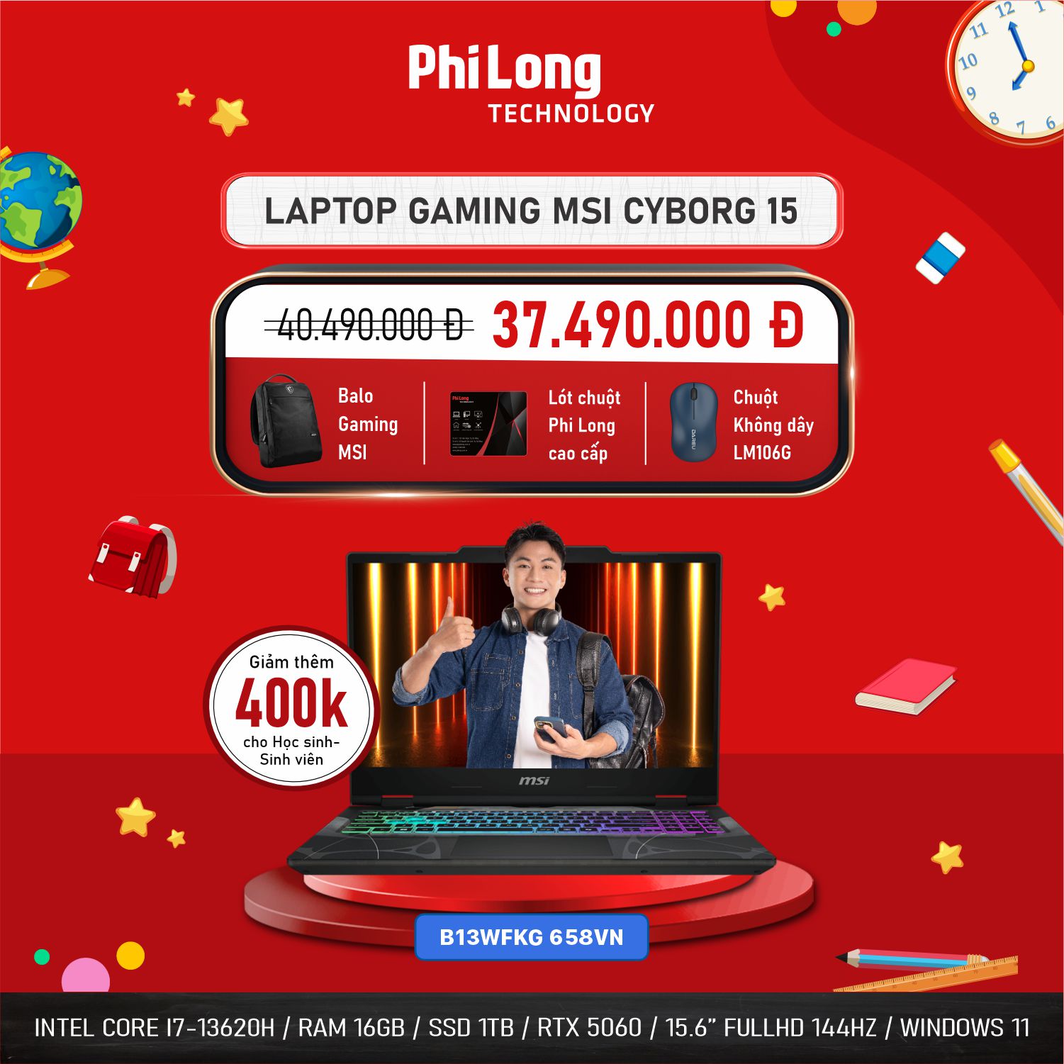 Laptop Gaming MSI Cyborg 15 B13WFKG 658VN (Intel Core i7-13620H, RAM 16GB, SSD 1TB, RTX 5060, Màn Hình 15.6inch FullHD 144Hz, Windows 11 Home, Màu Đen)