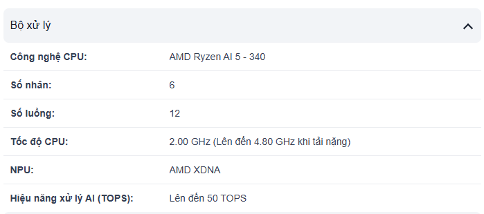 (0 lượt đánh giá)CPU: AMD Ryzen AI 5 340 (6 Nhân, 12 Luồng, 2.0Ghz up to 4.8Ghz, 16MB), AMD XDNA, Hiệu năng xử lý AI (TOPS) lên đến 50 TOPS