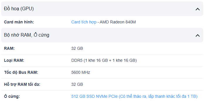 Ổ cứng: 512GB SSD M.2 2242 PCIe 4.0x4 NVMe(Tháo ra lắp Max 1TB)