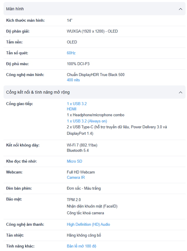 Màn hình: 14 inch WUXGA (1920x1200) tấm nền OLED hình ảnh rực rỡ, sắc nét, 400nits Glossy, 100% DCI-P3, DisplayHDR™ True Black 500