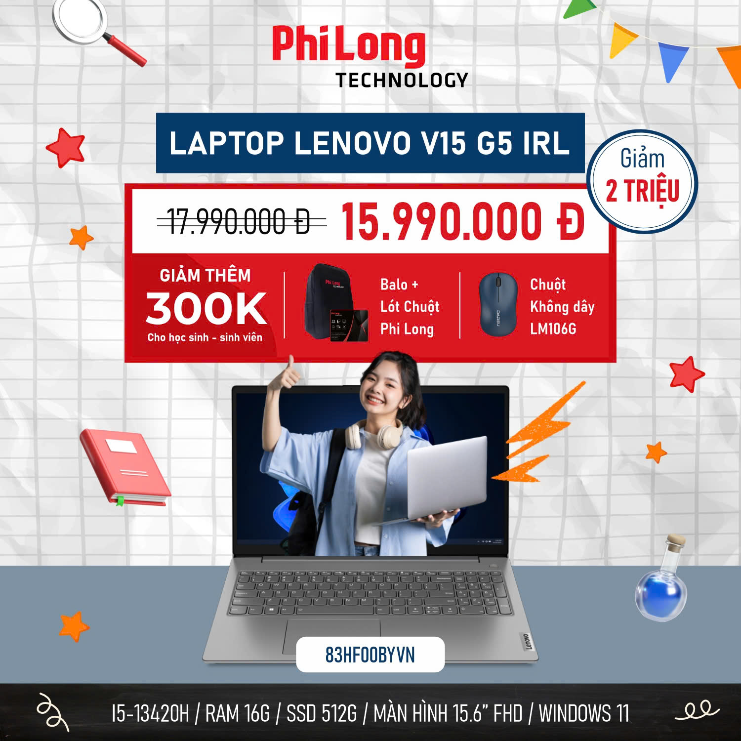 Hỏi đáp về Laptop Lenovo V15 G5 IRL (83HF00BYVN) (Intel Core i5-13420H, Ram 16GB, SSD 512GB, Intel UHD Graphics, Màn Hình 15.6inch FullHD, Windows 11 Home, Màu Xám)