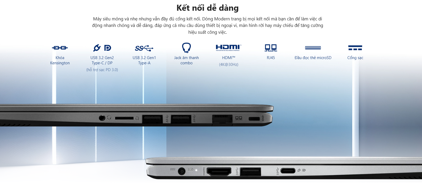 Dù sở hữu thiết kế mỏng, Modern 14 vẫn giữ lại đầy đủ các cổng kết nối quan trọng: