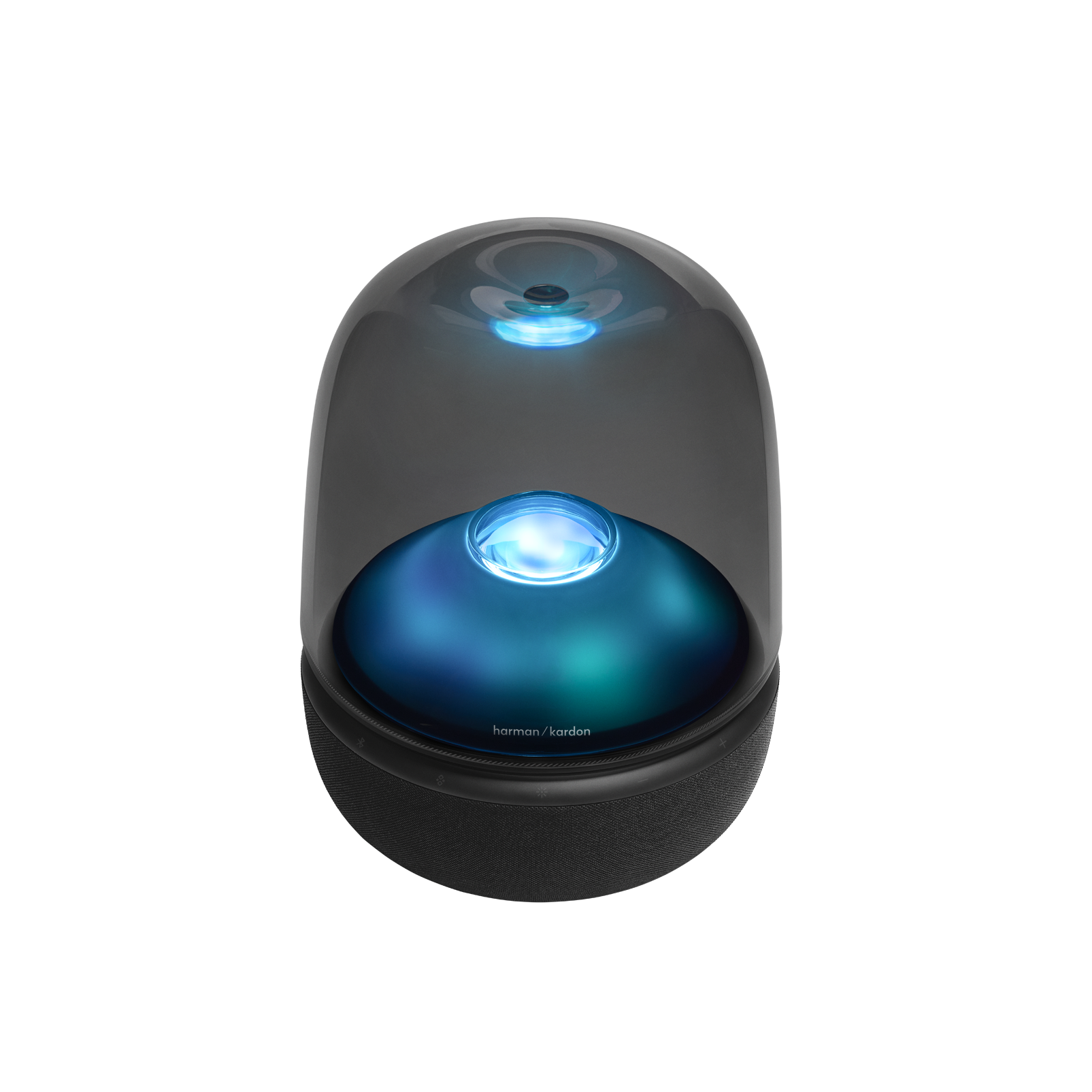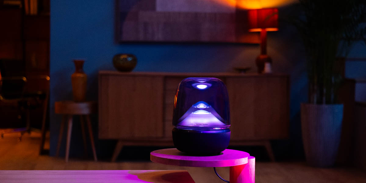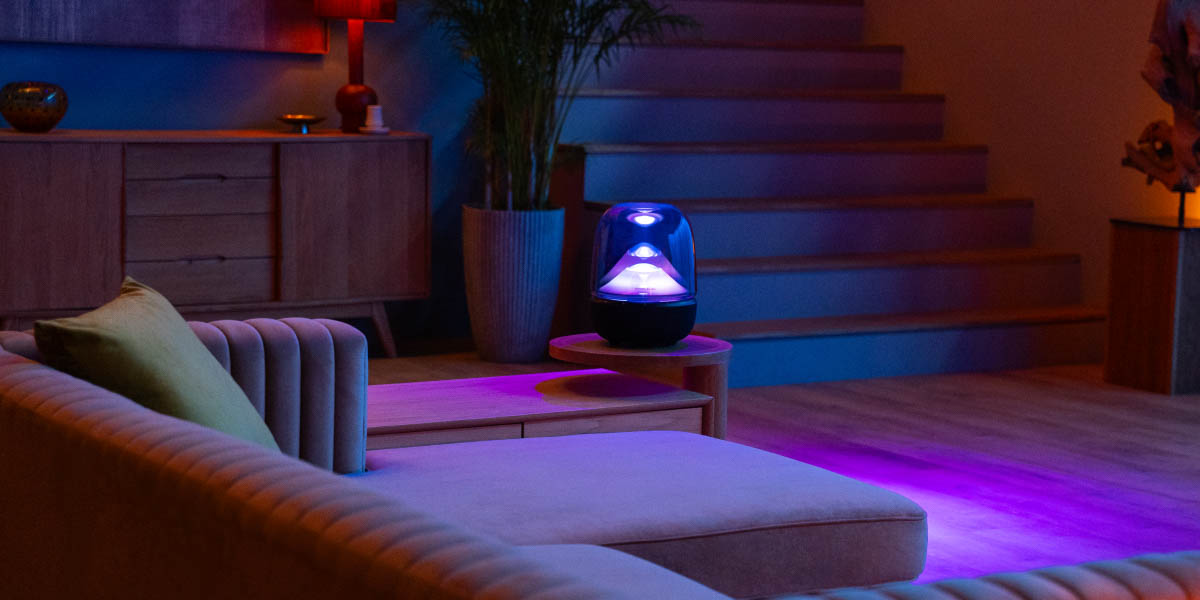Đặc biệt, loa Bluetooth Harman Kardon Aura Studio 5 được trang bị hệ thống đèn LED 360° có thể tùy chỉnh qua ứng dụng. Đèn có thể thay đổi theo giai điệu, tạo ra hiệu ứng ánh sáng ấn tượng và sang trọng, phù hợp với từng bài nhạc đang phát.