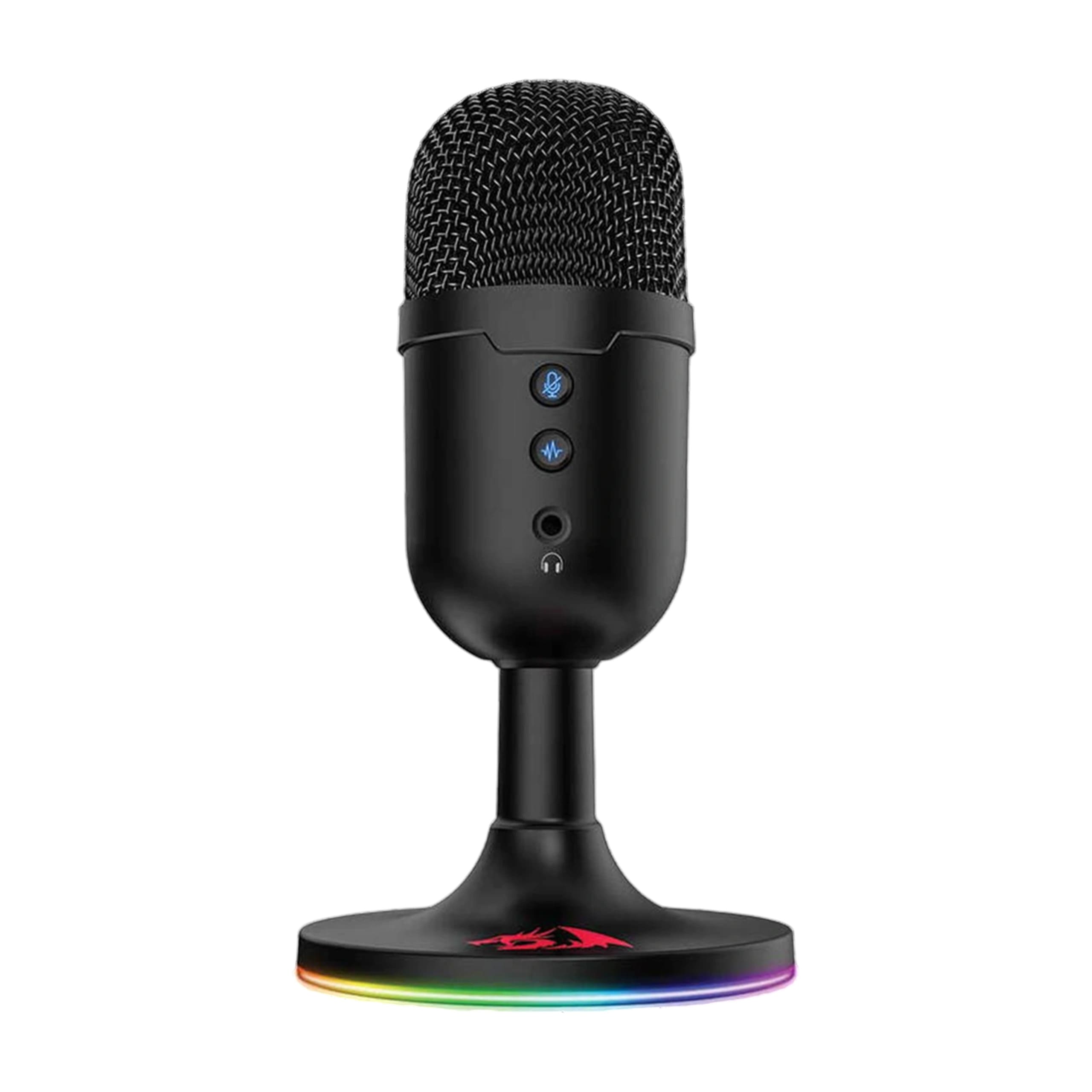 Thân micro màu đen tối giản, phía trước tích hợp các nút điều khiển vật lý và cổng tai nghe 3.5mm, cho phép theo dõi âm thanh trực tiếp khi thu. Phần đế tròn chắc chắn với logo Redragon nổi bật, viền LED RGB đa màu phát sáng xung quanh, mang lại vẻ ngoài hiện đại, phù hợp cho setup gaming, streaming và làm việc tại nhà.