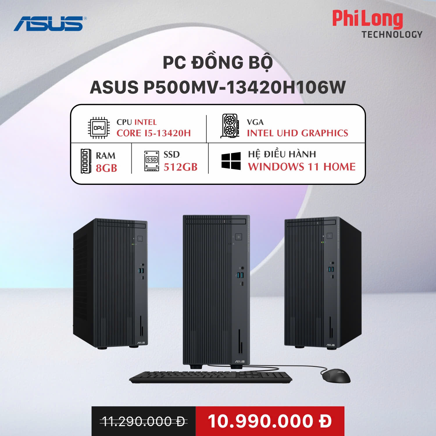 Hỏi đáp về Máy Tính Để Bàn PC Đồng Bộ ASUS P500MV-13420H106W (Intel Core i5-13420H, RAM 8GB, SSD 512GB, Intel UHD Graphics, Bộ Nguồn 180W, Windows 11 Home, Kèm Phím Chuột)