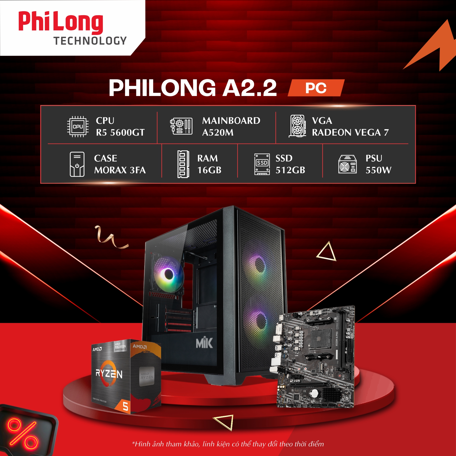 Hỏi đáp về PC Phi Long Office A2.2 (Ryzen 5 5600GT, A520M, RAM 16GB, SSD 512GB, PSU 550W, WiFi)
