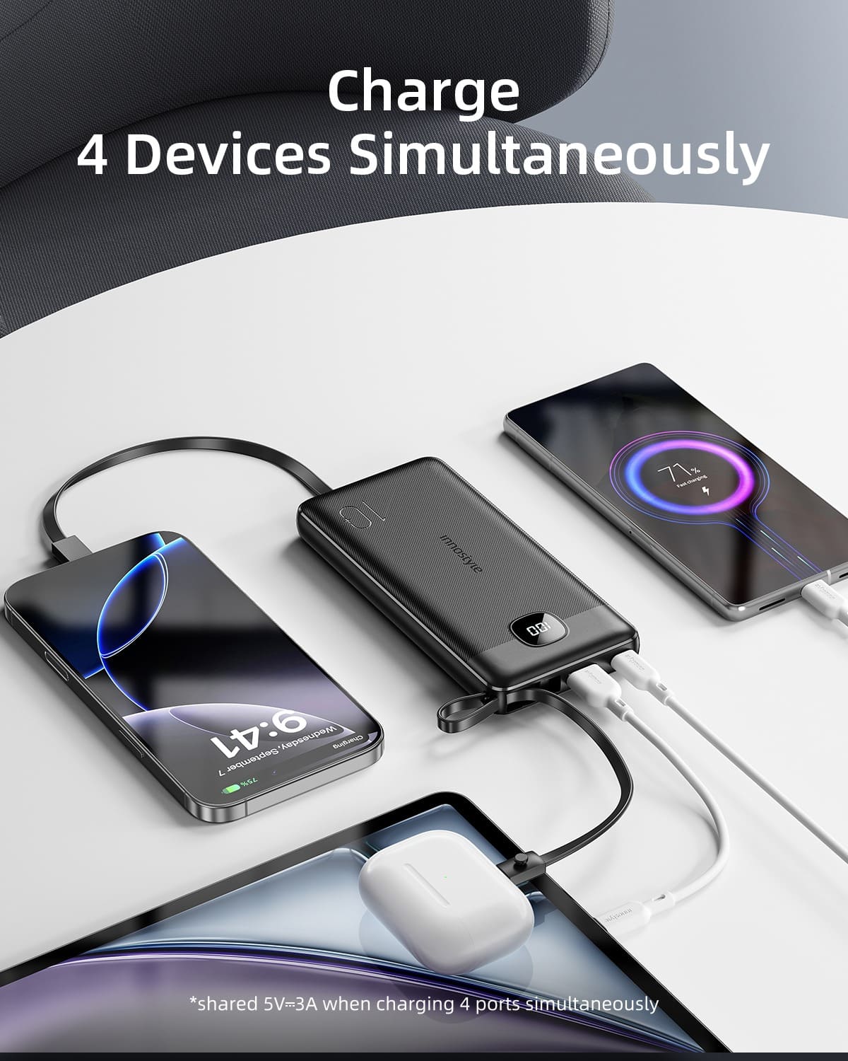 - Tích hợp 3 dây sạc đa năng: Lightning cho iPhone, USB-C cho iPhone 15/16 & Android, USB-A tiện dụng – không cần mang theo cáp rời.