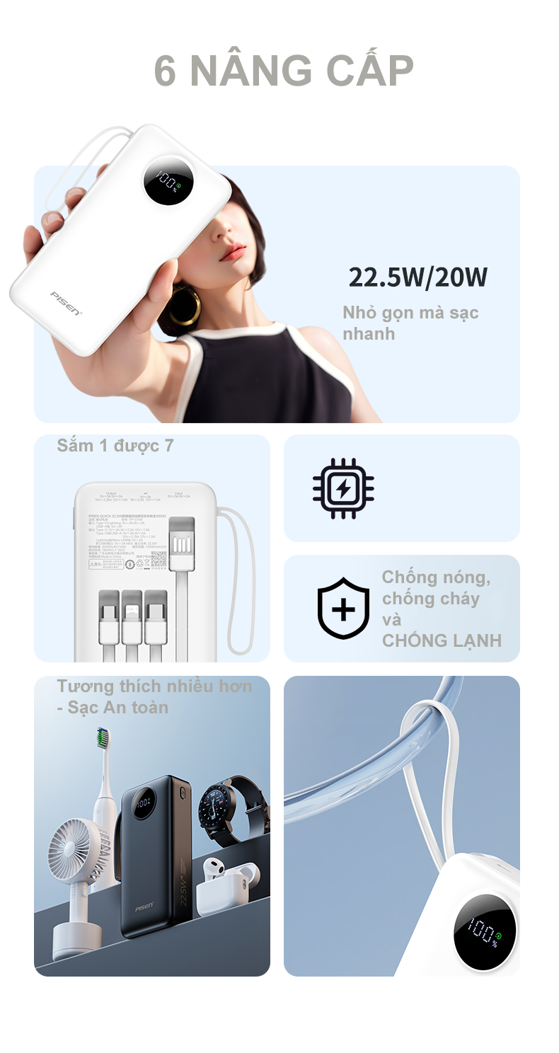 | Công nghệ/Tiện ích | Tích hợp nhiều cáp sạc tiện lợi |