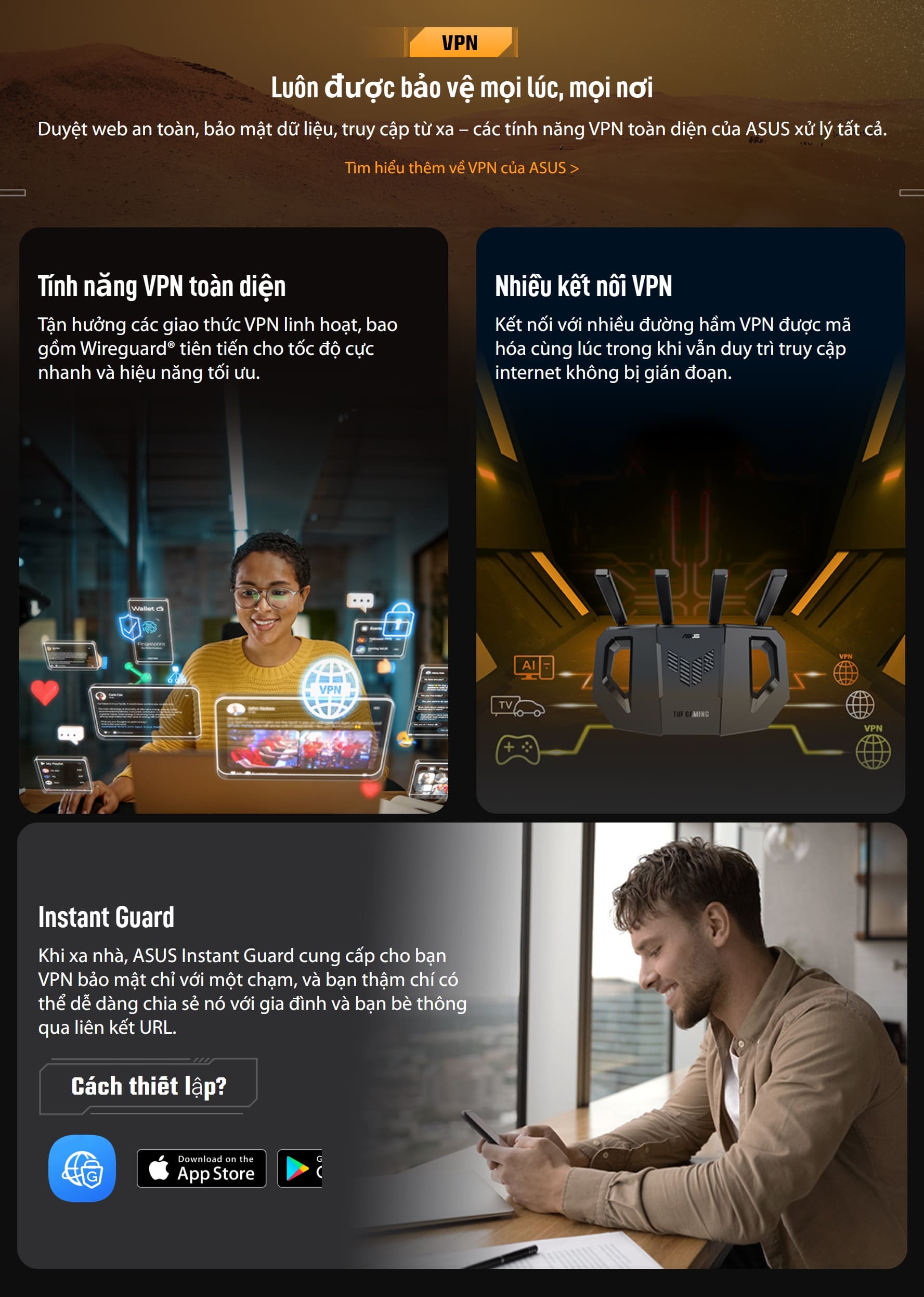 "Guest Network cung cấp kết nối Internet cho khách nhưng hạn chế quyền truy cập vào mạng cục bộ của bạn." • Tối ưu Quy tắc mạng Guest :2.4GHz x3, 5GHz x3 Giới hạn thời gian kết nối mạng Khách |