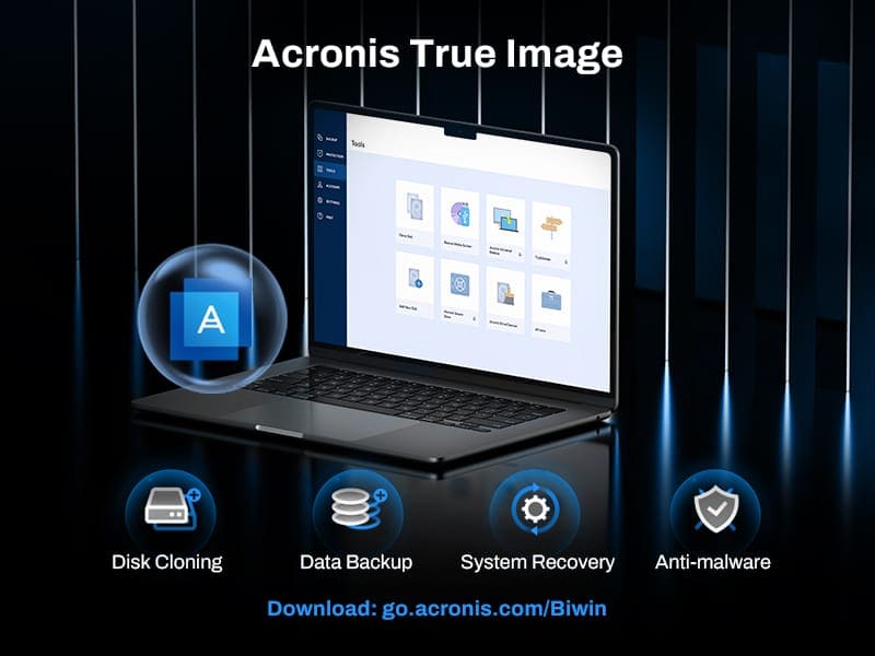 Ổ cứng SSD Biwin đi kèm với phiên bản tùy chỉnh miễn phí của phần mềm Acronis True Image để truyền dữ liệu đáng tin cậy, sao lưu và phục hồi hệ thống, chống phần mềm độc hại và các mục đích sử dụng khác. Phiên bản của chúng tôi giúp giải quyết những khó khăn khi sao lưu và đảm bảo tính bảo mật cho dữ liệu của bạn.
