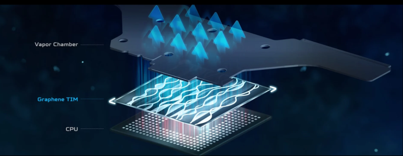 TIM Graphene mang lại khả năng dẫn nhiệt cao hơn đáng kể so với vật liệu tản truyền thống, tăng hiệu quả làm mát lên đến 14,5%. Nhờ đó, nhiệt được giảm nhanh hơn và hiệu năng của hệ thống được giữ ổn định trong quá trình vận hành. Buồng hơi đi kèm giúp phân bổ nhiệt đều trên toàn bề mặt, hạn chế tình trạng nóng cục bộ và duy trì sức mạnh ổn định cho CPU.