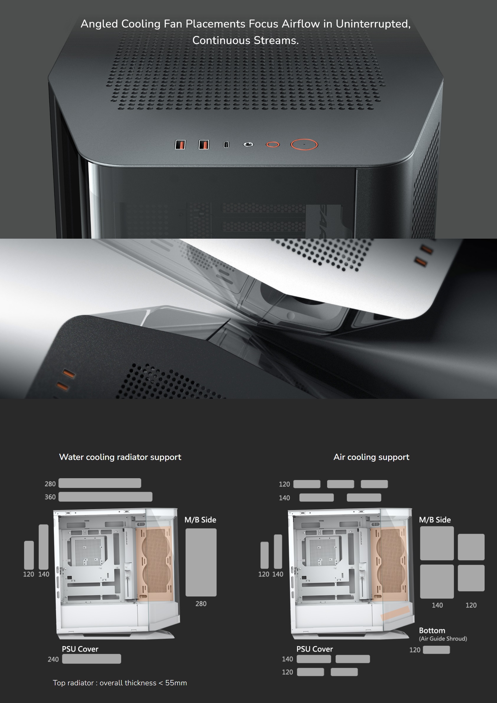 | Hỗ trợ tản nhiệt nước | Trên: 360mm / 280mm / 240mm / 140mm / 120mm Bên hông: 280mm / 240mm / 140mm / 120mm Nắp che nguồn: 240 mm / 120mm Sau: 140 mm / 120 mm |