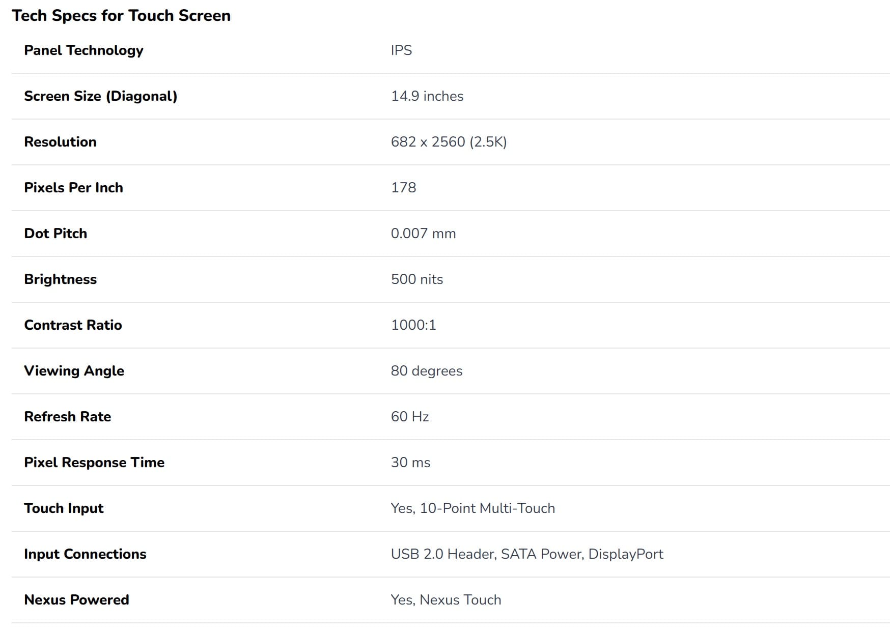 Loại tấm nền: IPS, cảm ứng điện dung Kích thước màn hình: 14.9 inch Độ phân giải: 682 x 2560 (2.5K) Số điểm ảnh trên mỗi inch: 178 Độ sáng: 500 nits Tỷ lệ tương phản: 1000:1 Góc nhìn: 80 độ Tần số quét: 60Hz Thời gian phản hồi điểm ảnh: 30ms Kết nối đầu vào: Đầu cắm USB 2.0, Nguồn SATA, DisplayPort |