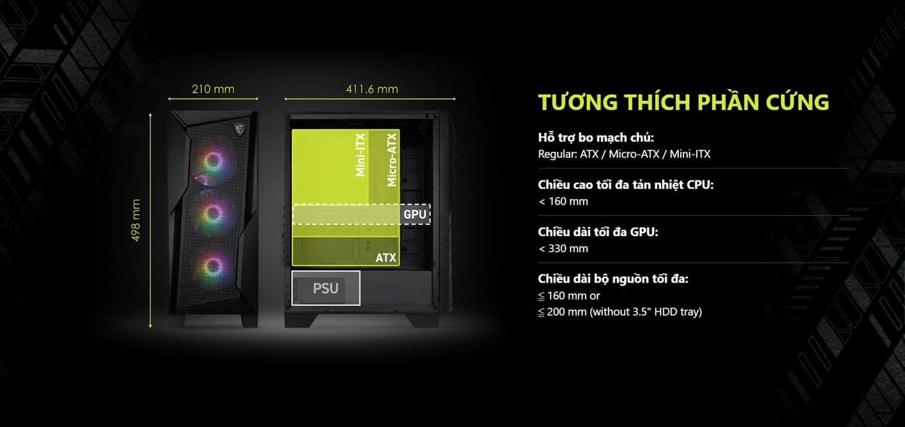 Hỗ trợ tản nhiệt CPU cao tối đa 160mm, VGA dài tối đa 330mm, PSU dài tối đa 200mm