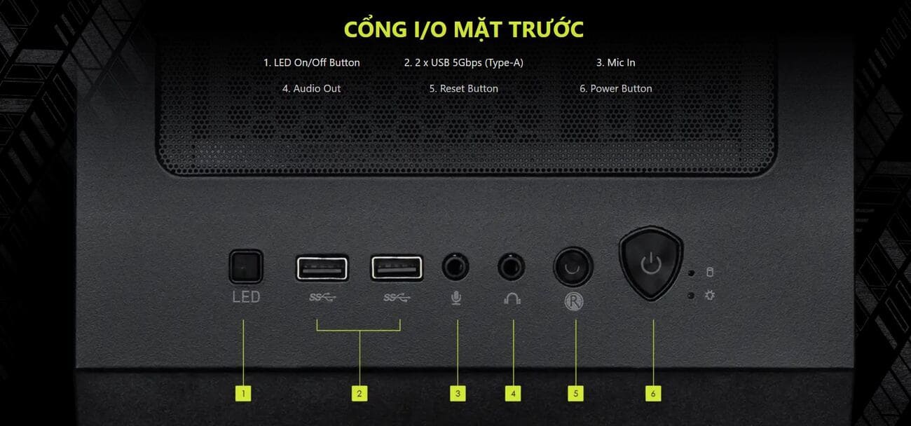 Cổng I/O: 2x USB 5Gbps (Type-A), 1x LED On/Off, 1x Audio/Mic, Power/Reset