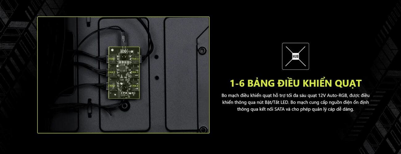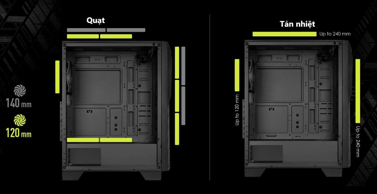Hỗ trợ quạt tản nhiệt: Trên: 2x 120/140mm, Trước: 3x 120 mm / 2x 140 mm, Sau: 1x 120 mm, Đáy: 2x 120 mm