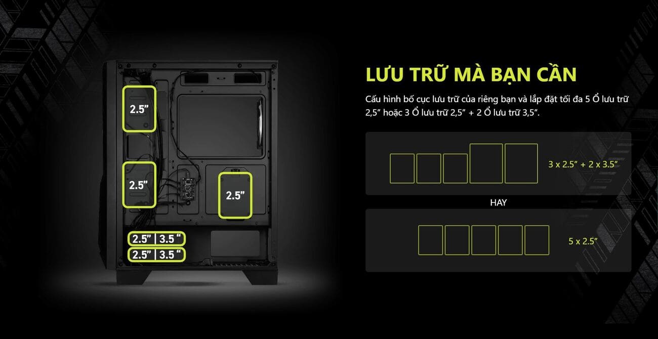 Khe ổ cứng: 3 x 2.5” + 2 x 2.5”/3.5” Combo