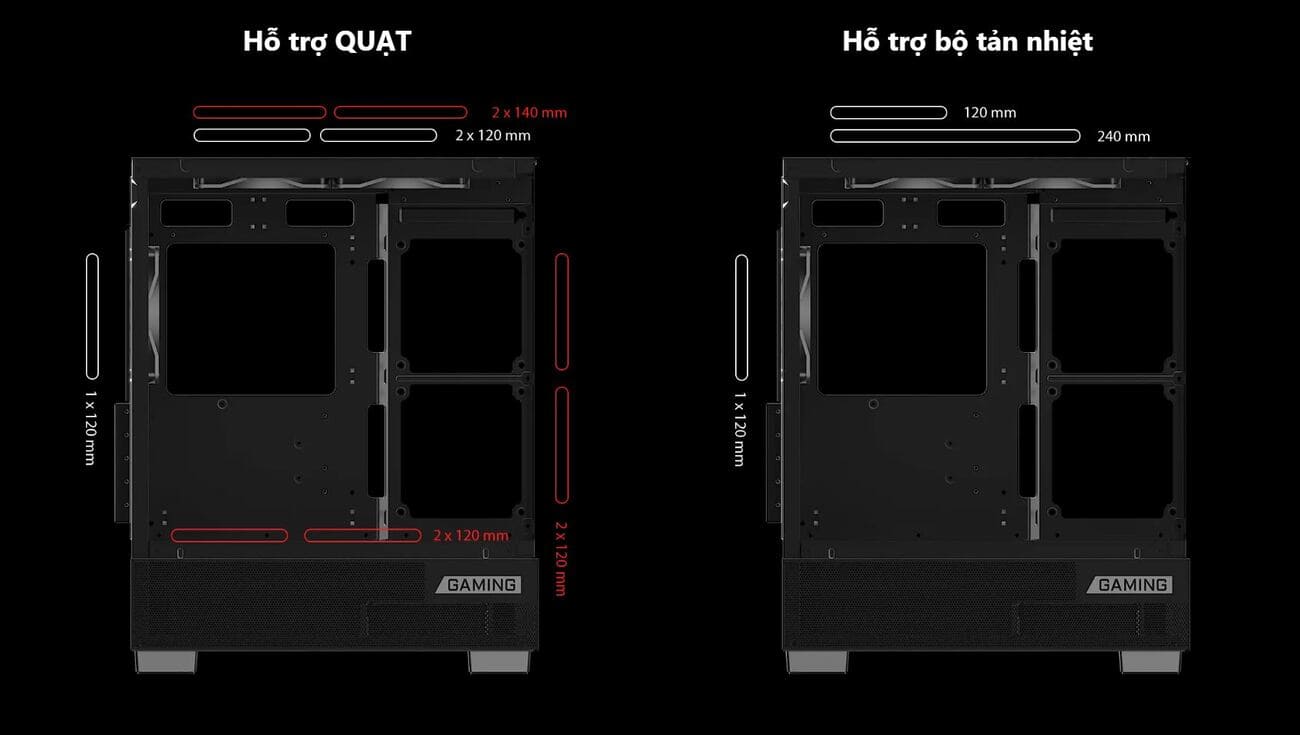 Phía trên: 2 x 120 mm / 2 x 140 mm Phía sau: 1 x 120 mm Mặt hông: 2 x 120 mm (chiều dài mainboard tối đa 220mm) Dưới đáy: 2 x 120 mm |