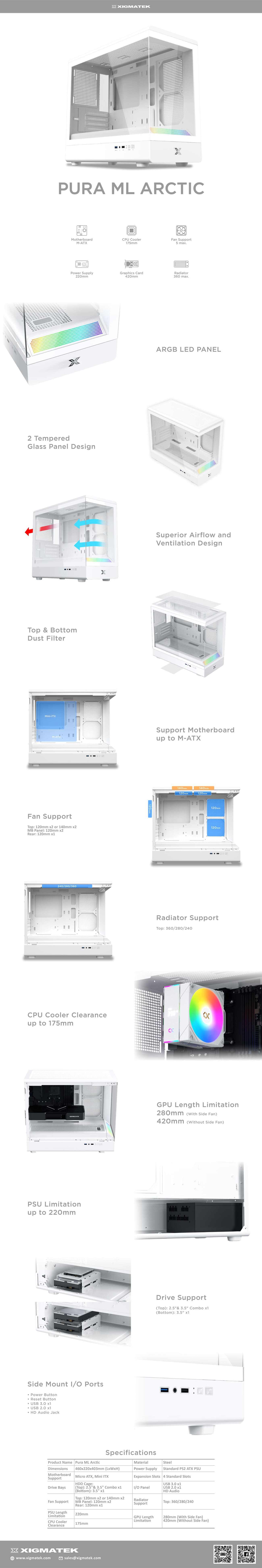 Vỏ Case Xigmatek Pura ML Arctic - EN48470 (m-ATX, No fan, Max 5 fan, Rad 360, ARGB LIGHTING BAR)